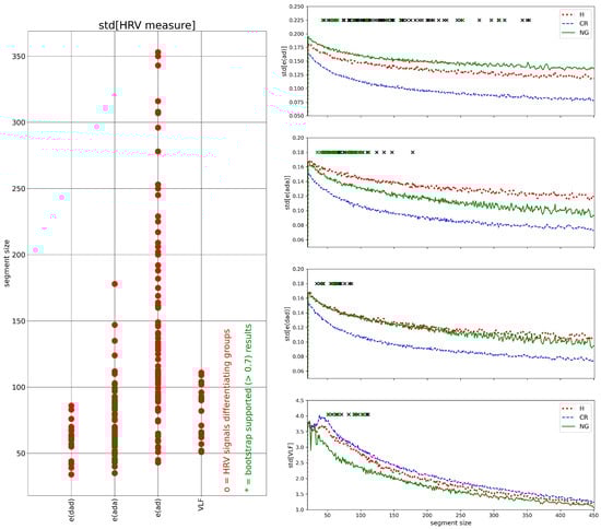 In order to gain insight into transient time events, we propose considering each signal as a series of short subsequent segments, sliding windows of a fixed size, where metrics of the HRV are estimated individually. The series of HRV values captured instantaneous alterations in HRV []. For example, a window with a minimal or maximal heart rate might represent the vagal activity at different stages of sleep [,]; a window where the standard deviation (std) of RR intervals is minimal might provide the HRV baseline []. Five non-overlapping ten-minute segments of RR intervals, defined by the lowest heart rate, together with random ten-minute segments as the control, were successfully used in a logistic regression classifier to characterize post-traumatic stress disorder [].