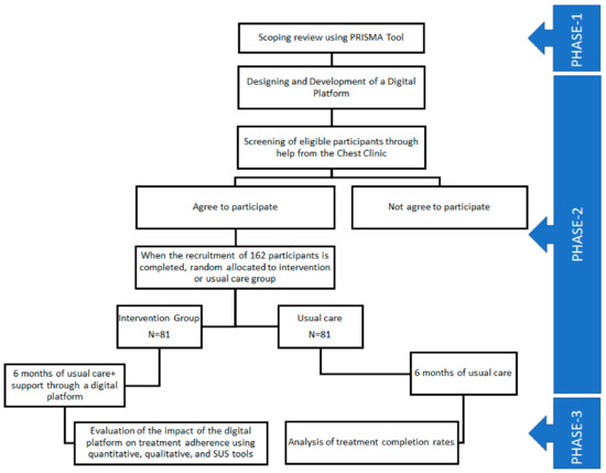 Phase 1: In this phase, a scoping review method will be used to conduct a systematic literature review using the PRISMA tool to report on various digital interventions focused on treatment adherence in LTBI patients. The approach developed by Arksey and O’Malley [29]—which has since been updated by Levac et al. [30] and the Joanna Briggs Institute (JBI) [31]—will be used for the scoping review. Based on these approaches to scoping reviews, the following five stages or categories are identified: (a) defining the research issue; (b) finding pertinent studies; (c) choosing the appropriate studies; (d) synthesizing and evaluating the information that was retrieved; and (e) compiling, summarizing, and presenting the results.