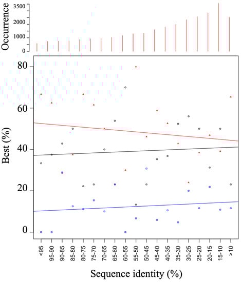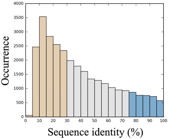 From the dataset of 89 proteins, a total of 29,571 alignments were generated, which correspond to an average value of 332 degenerated alignments per protein. This value depends on the protein length. The distribution of scrambled sequences ranked by sequence identity is shown in Figure 1. The average sequence identity is 38.9% (for a median of 32.55%) and reaches a peak for the 10–15% interval with more than 3500 alignments available. As the generation of sequences with very low identity percentages (<10%) can be time-consuming, we limited the number of sequence generation, which resulted in a drop in this category. This distribution, which looks roughly as an extreme value distribution, shows that it is easier to generate sequences with low sequence identity than with high sequence identity. It also underlines the interest of categorizing 3 main classes of alignments: good for a sequence identities higher than 75% (3682 sequences), bad for sequence identities less than 35% (15,786 sequences), and medium for the sequences between them (10,102 sequences). For each alignment, 25 models were built using Modeller [49].