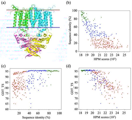 Example of putative metal-chelate type ABC transporter (PDB ID 2NQ2). (a) Three-dimensional visualization, (b) sequence identity of the alignments (%) vs. HPM scores (103), (c) GDT_TS vs. sequence identity of the alignments (%), and (d) GDT vs. HPM scores (103). (b–d) good alignment (green), intermediate alignment (blue) and bad alignment (red).