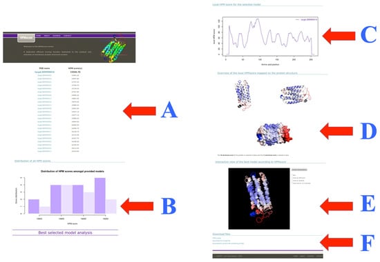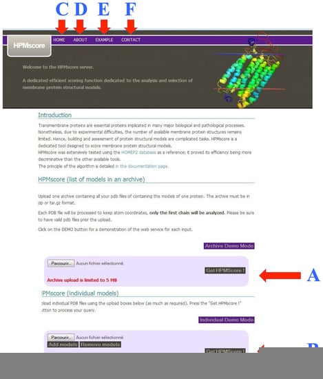 The web server can be accessed at the following url: https://www.dsimb.inserm.fr/dsimb_tools/hpmscore/index.php, accessed on 1 March 2023). The main page gives a small introduction and a direct access to the section for uploading the structural models (see Figure 4). Two options are possible that consist of: (i) Analyzing models one by one (see Figure 4B); or (ii) A set of models uploaded from an archive (see Figure 4A). Please note that structural models must be provided in a classical PDB format, as generated by Modeller [14], Robetta [69], RoseTTAfold [70], AlphaFold2 [40], I-Tasser and other classical approaches.