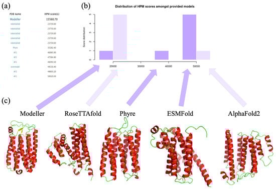 Comparison of different structural models coming from different methodologies for a Halorhodopsin. (a) The list of the different methodologies is provided, (b) the corresponding HPM score histogram with (c) the visualization of different structural models from Modeller, RoseTTAfold, Phyre, ESMFold, and AlphaFold2. Please notice that PDB files of RoseTTAfold have been saved in proper PDB format with PyMOL.