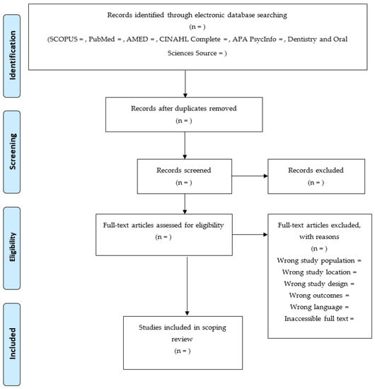 - Peters, M.D.; Godfrey, C.M.; Khalil, H.; McInerney, P.; Parker, D.; Soares, C.B. Guidance for conducting systematic scoping reviews. Int. J. Evid. Based Healthc. 2015, 13, 141–146. [Google Scholar] [CrossRef] [PubMed]