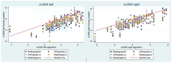 The algorithm was not able to analyze 7 of the 78 radiographs. The remaining 71 images were analyzed by both the algorithm and readers and were therefore included in the study. For the 71 radiographs, the average age was 50.1 years, and the gender distribution was 36 females and 35 males. The mJSW values tended to be lower for the readers than for the algorithm. For the five readers, the mean measured mJSW for the left hip ranged from 3.27 to 3.59 mm, whereas it was 3.96 mm for the algorithm. On the right side, the corresponding measurements ranged from 3.27 to 3.65 mm for the readers and 4.05 mm for the algorithm (Figure 2 and Table 1).
