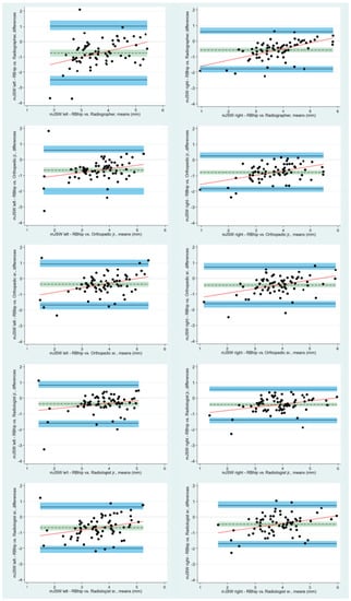 The mean value, standard deviation (SD), and range for all measurements were calculated, and scatterplots were used to visualize bivariate associations. The difference between the first and second measurements by the algorithm was presented with mean, SD, range, and first and third quartiles. Bland–Altman (BA) plots with limits of agreement (LoA), bias, and 95% confidence intervals (CI) were used to illustrate the agreement between the algorithm and the readers individually. The LoA are defined as the estimated interval wherein 95% of all differences between the algorithm and the readers will fall, assuming that all the data are normally distributed while the bias is defined as the mean measured difference between algorithm and reader [14,15]. Finally, repeatability coefficients (RCs) were calculated to assess inter- and intraobserver variability. The RC represents the value below which an absolute difference between 2 repeated measurements will fall with a probability of 95%. All p-values < 0.05 were considered statistically significant. For all statistical analyses, STATA version 17.0 (StataCorp. 2021, College Station, TX, USA) was used.