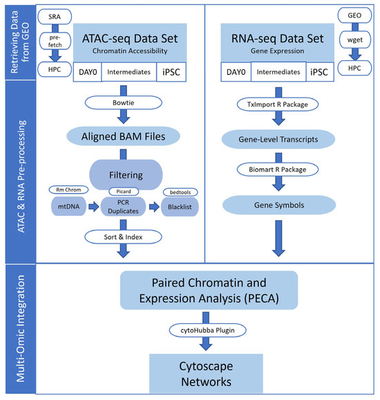 Methods diagram of multi-omic data integration procedure. RNA and ATAC sequencing data were obtained from publicly available Gene Expression Omnibus (GEO) repositories. The data were processed into the binary alignment and map (BAM) file and gene-level transcripts per million (TPM) format for integration with paired expression and chromatin accessibility analysis. Integrative regulatory networks were generated and visualized with Cytoscape software version 3.9.1.