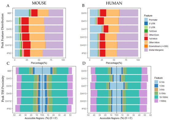 Peak locations show diverse changes in chromatin accessibility across species and datasets. The Chipseeker1 R package was used to generate plots of locations of consensus peaks and their genomic features. Mouse diagrams show the intersected ATAC peaks from two murine datasets (GSE101905 and GSE93029). Human diagrams show the intersected ATAC peaks from two different human donors (GSE147641). (A,B) The distribution of peaks within the genome in terms of promoters, introns, exons, and other regions at the different timepoints by species. (C,D) The distribution of peak locations with respect to the transcription start site (TSS) at the different timepoints by species.