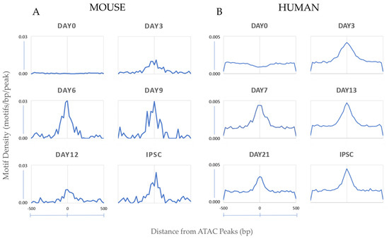 Motif instances centered on accessible peaks. Oct4−Sox2−Tcf−Nanog (OSTN) motif proximity to regulatory regions/putative enhancers located in accessible chromatin sites increases in both mouse (A) and human (B) reprogramming cells at the later timepoints. The number of instances of the OSTN motif per base pair per peak is indicated on the y-axis and the distance from ATAC peaks in base pairs is indicated on the X-axis. Peaks with the top 5000 p-values were selected for mouse motif density analysis.