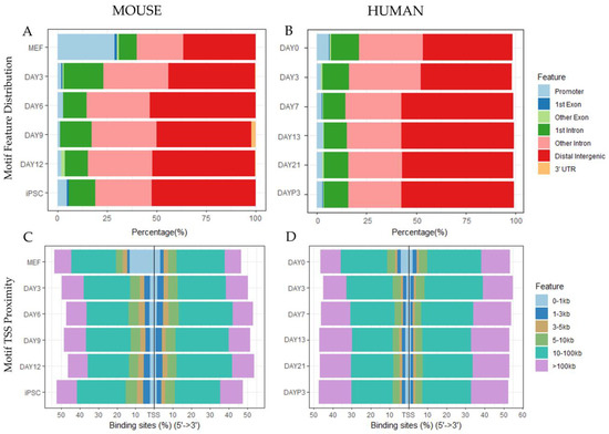 Oct4-Sox2-Tcf-Nanog (OSTN) orchestrates changes from distal enhancers. The Chipseeker R package was used to generate plots of locations of the OSTN motif. Mouse diagrams (A,C) show the intersected ATAC peaks from two murine datasets (GSE101905 and GSE93029). Human diagrams (B,D) show the intersected ATAC peaks from two different human donors (GSE147641). The distribution of the OSTN motif within the genome in terms of promoters, introns, exons, and other regions at different timepoints by species. The distribution of OSTN motif instances with respect to the transcription start site (TSS) at the different timepoints by species.