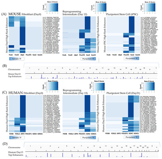 In addition to pioneer transcription factors with the capacity to remodel chromatin, other epigenetic factors contributing to the openness state of these enhancers were also investigated. Chromatin regulators with the most interactions with the top 50 enhancers from the day 9 mouse and day 13 human samples included Chd4, a subunit of the NuRD complex that is required for the maintenance of stem cell renewal [74] and the histone methyl transferase Ezh2, which is required for a key step in iPSC generation, mesenchymal–epithelial transition [75] (Figure 6C,D). Other members of the CHD remodeling factor family, which are reported to actively open chromatin during factor-induced reprogramming, also exhibited high numbers of enhancer interactions [76]. Additionally, the H3K4me3 effector WDR5 [77], which binds to, activates, and co-occupies many pluripotency genes in coordination with Oct4 [77,78], was identified as a regulator of the selected 50 human enhancers. Chromatin regulators had the most statistically significant interactions with the highly ranked enhancers on the day the enhancers were detected, day 9 for mouse and day 13 for human. However, many of these enhancers remained open and highly ranked throughout the reprogramming process and maintained interactions with chromatin regulators at other timepoints.