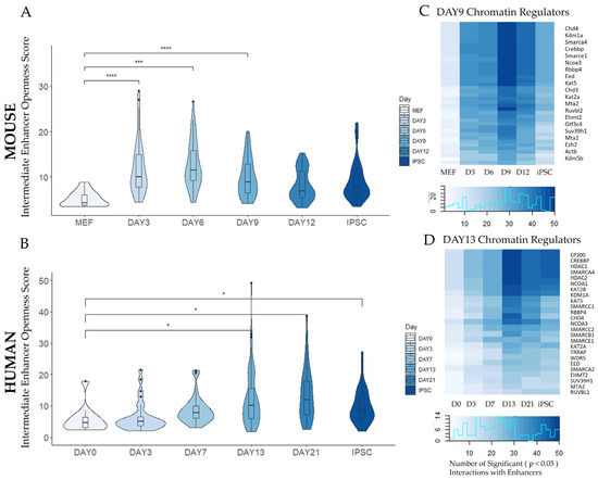 Enhancer dynamics during reprogramming. (A,B) The top 50 enhancers mediating TF–TG interactions with the highest regulation scores at an intermediate timepoint (day 9 for mouse, day 13 for human) were identified with paired expression and chromatin accessibility analysis (PECA2). Openness distributions of these 50 enhancers were compared at each time point, indicating intermediate enhancers open shortly after reprogramming-inducing doxycycline treatment on day 3 (mouse) or shortly after transfer to naïve stem cell media on day 13 (human). The distribution of the enhancers’ openness is shown through violin plot curvature, where the majority of enhancers appear where the width of the violin plot is widest, and statistical outliers are plotted as individual points. Median values are indicated with a boxplot, with lower and upper hinges that correspond to the first and third quartiles (the 25th and 75th percentiles). Statistical significance was calculated in a pair-wise manner between the fibroblast stage and the corresponding timepoint (indicated with brackets) using a paired t-test. Statistical significance calculations are demarcated by asterisks: * (p ≤ 0.05), *** (p ≤ 0.001), **** (p ≤ 0.0001). (C,D) Chromatin regulators (shown on the y-axis) affecting the acetylation and methylation of these enhancers were identified and ranked by the number of significant (p ≤ 0.05) interactions with the selected 50 enhancers. Time points collected on each day (abbreviated as (D)) are indicated on the x-axis. The distribution of values in each heatmap is visualized as a color key and histogram plot.
