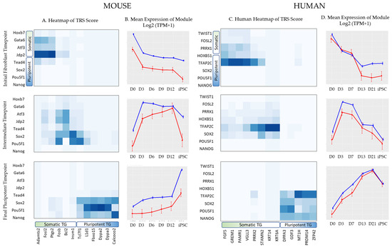 Analysis of core regulatory modules for mouse and human. (A) Heatmap of the normalized trans-regulatory score (TRS) on selected transcription factors and target genes for three mouse time points: an initial fibroblast timepoint (day 0), an early intermediate timepoint (day 3), and a final pluripotent timepoint. Transcription factors and target genes indicated on the axes are clustered by their association with fibroblast or pluripotent cell type. (B) Heatmap of the normalized trans-regulatory score (TRS) on selected transcription factors and target genes for three human time points, an initial fibroblast timepoint (day 0), an early intermediate timepoint (day 3), and a final pluripotent timepoint (day 21). (C,D) Mean expression pattern of transcription factors (shown in red) and the target genes they are predicted to regulate (shown in blue), represented as a log2 + 1 transformation of the transcripts per million (TPM) values for mouse (B) and human (D). Error bars indicate the standard error.
