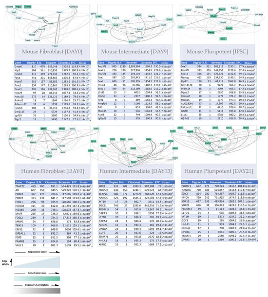 Multi-timepoint networks containing between 244,978 and 328,433 unique TF–TG interactions were identified in mouse, and between 146,134 and 373,283 interactions in human. Network centrality analysis was conducted on full PECA-generated networks containing thousands of transcription factor and target gene interactions in order to better understand the function and regulatory relationships of each gene (Supplemental Tables S1–S4). Reprogramming networks were contrasted with the control fibroblast networks, and common genes were removed from the analysis to identify pathways that were specific to the reprogramming and pluripotent stages. Multiple centralities, including bottleneck (B.N.), closeness, betweenness, and stress, were calculated for each gene to identify central elements of the networks and infer the importance of nodes in each network. Tables containing topological and centrality analysis are provided for each network, ordered by bottleneck centrality.