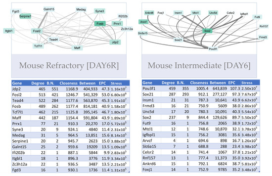 Mouse refractory versus reprogramming network comparison. Differential networks between mouse refractory and reprogramming cells from day 6 were compared. Networks include the highest gene–gene interaction scores inferred by PECA. Differential network files created by comparing the refractory and successfully reprogramming samples using the PECA_compare function. PECA regulatory score is represented by edge thickness and gene expression by node color. Tables including several kinds of centralities calculated by the Cytoscape application Cytohubba are supplied for each timepoint, including node degree and bottleneck (B.N.) centrality.