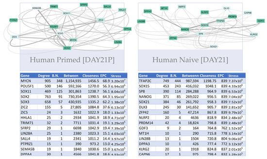 Human primed versus naïve reprogramming network comparison. Differential networks between human naive and primed cells from day 21 were compared. Networks include the highest gene–gene interaction scores inferred by PECA. Differential network files created by comparing the naive and primed samples using the PECA_compare function. PECA regulatory score is represented by edge thickness and gene expression by node color. Tables including several kinds of centralities calculated by the application Cytohubba are supplied for each timepoint, including node degree and bottleneck centrality.