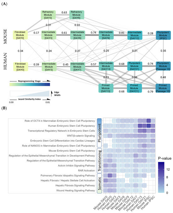 In order to determine how many of these TF–TG interactions were conserved between timepoints and between species, the content of networks was compared (Figure 11A). During human reprogramming, regulatory networks became increasingly similar to each other and to the pluripotent endpoint as reprogramming progressed. A similar pattern was observed in the mouse reprogramming experiment, where modules became increasingly similar to the penultimate day 12 timepoint, however, intermediates shared less similarity with the pluripotent timepoint. Mouse refractory cells closely resembled day 0 fibroblast cells and shared some similarity with successfully reprogramming cells at early stages, though this similarity decreased as reprogramming progressed. Human primed cells most closely resembled day 13 naïve cells, however, the similarity between the naïve and primed modules decreased as reprogramming continued. There was some interspecies overlap between mouse and human reprogramming intermediates, however, more overlap was found in the fibroblast and endpoint pluripotent stages.