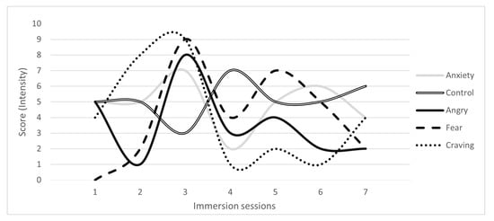 Intensity of emotions and craving felt at each immersion session. Anxiety, sense of control, anger, fear, and the intensity of cravings were measured on a scale from 0 (not at all) to 10 (very strongly) at the end of each of the 7 immersion sessions.