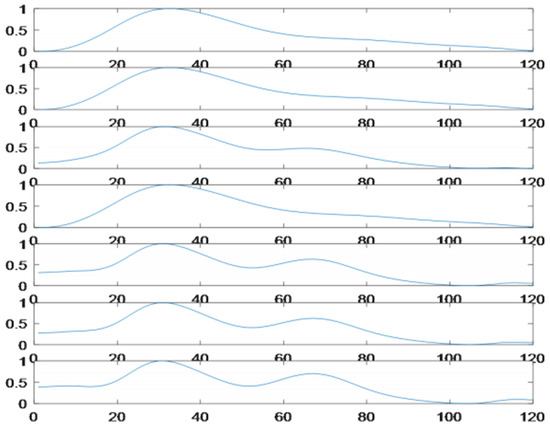 As the main goal of this work is to predict BP remotely by using a video camera, the proposed system is evaluated with the public rPPG datasets [38] to show its performance with rPPG signals. Similarly, the rPPG signals are segmented into beats and normalized to be in the range [0–1] using Equation (9). The normalized beats are then normalized in time to be with the fixed length (120). The time interval is used as a feature besides the normalized beats for BP prediction.