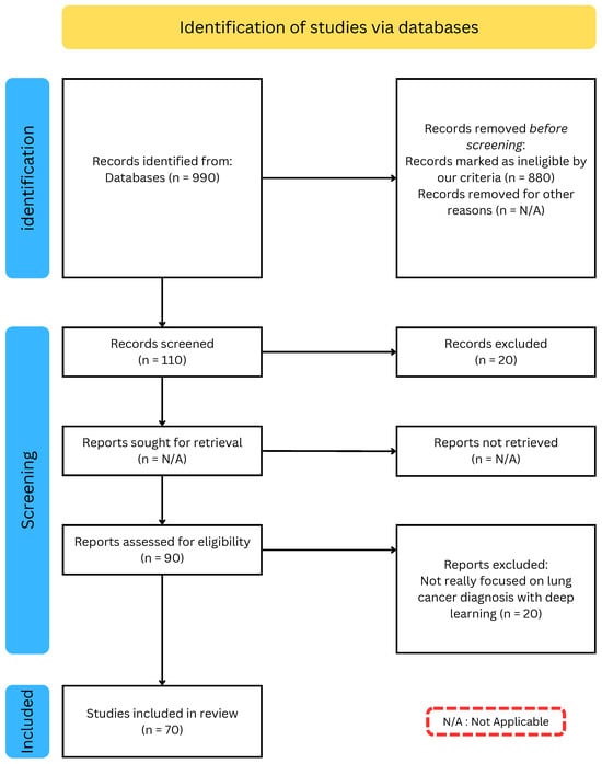Following this selection process, a final set of articles was obtained for the literature review, ensuring a diverse representation of studies addressing the intersection of deep learning, lung cancer and medical diagnosis. The PRISMA diagram [] in Figure 1 summarizes the successive stages of our literature search, from the initial identification of articles to the final selection of studies included in this review.