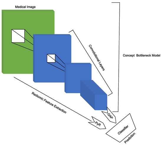 Brocki et al. [] highlight the limitations of deep neural networks (DNNs) in clinical applications for cancer diagnosis and prognosis due to their lack of interpretability. To address this issue, the authors proposes ConRad, an interpretable classifier that combines expert-derived radiomics and DNN-predicted biomarkers for CT scans of lung cancer. The proposed model is evaluated using CT images of lung tumors, and compared to CNNs acting as a black box classifier. The ConRad models using nonlinear SVM and logistic regression with Lasso outperforms the others in five-fold cross-validation, with the interpretability of ConRad being its primary advantage. The increased transparency of the ConRad model allows for better-informed diagnoses by radiologists and oncologists and can potentially helps in discovering critical failure modes of black box classifiers. However, the study’s limitations include the focus on a single dataset, and the lack of external validation, which warrants further investigation. Nonetheless, the proposed model demonstrates the potential for the broader incorporation of explainable AI into radiology and oncology, with the code available on [] for reproducibility. In Figure 2 presents the differents step use to obtain there results.