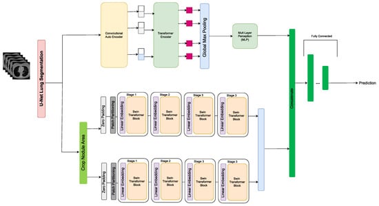 Khademi et al. [] proposed a novel hybrid discovery Radiomics framework that integrates temporal and spatial features extracted from non-thin chest CT slices to predict Lung Adenocarcinoma (LUAC) malignancy with minimum expert involvement. The proposed hybrid transformer-based framework consisted of two parallel paths: The first was the Convolutional Auto-Encoder (CAE) Transformer path, which extracted and captured informative features related to inter-slice relations via a modified Transformer architecture, and the second the Shifted Window (SWin) Transformer path, which extracted nodules related spatial features from a volumetric CT scan. The extracted temporal and spatial features were then fused through a fusion path to classify LUACs. The proposed CAET-SWin model combined spatial and temporal features extracted by its two constituent parallel paths (the CAET and SWin paths) designed based on the self-attention mechanism. The experimental results on a dataset of 114 pathologically proven Sub-Solid Nodules (SSNs) showed that the CAET-SWin significantly improved reliability of the invasiveness prediction task while achieving an accuracy of 82.65%, sensitivity of 83.66%, and specificity of 81.66% using 10-fold cross-validation. The CAET-SWin significantly improved reliability of the invasiveness prediction task compared to its radiomics-based counterpart while increase the accuracy by 1.65% and sensitivity by 3.66%. Figure 3 presents the pipeline proposed by Khademi et al.