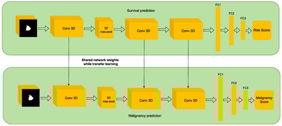 Mukhjerjee et al. [] developed LungNet, a shallow CNN to predict the outcomes of patients with NSCLC. LungNet was trained and evaluated on four independent cohorts of patients with NSCLC from different medical centers. The results showed that the outcomes predicted by LungNet were significantly associated with overall survival in all four independent cohorts, with concordance indices of 62%, 62%, 62%, and 08% on cohorts 1, 2, 3, and 4, respectively. Additionally, LungNet was able to classify benign versus malignant nodules on the LIDC dataset with an improved performance (AUC = 85%) compared to training from scratch (AUC = 82%) via transfer learning. Overall, the results suggest that LungNet can be used as a non-invasive predictor for prognosis in patients with NSCLC, facilitating the interpretation of CT images for lung cancer stratification and prognostication. The Figure 4 shows the process of making predictions using LungNet. The input to LungNet is a CT image of a lung tumor. The network then extracts features from the image using a series of convolutional layers. These features are then passed through a fully connected layer to make a prediction about the patient’s prognosis. The code for LungNet is available at [].