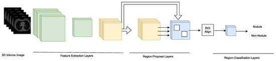 Katase et al. [] worked on the development of a CAD system that automatically detects lung nodules in CT images. The main challenge faced by radiologists is identifying small nodule shadows from 3D volume images which can often result in missed nodules. To address this issue, the researchers used deep learning technology to design an automated lung nodule detection system that is robust to imaging conditions. To evaluate the detection performance of the system, the researchers used several public datasets including LIDC-IDRI and SPIE-AAPM as well as a private database of 953 scans and 1177 chest CT scans from Kyorin University Hospital. The system achieved a sensitivity of 98.00/96.00% at 3.1/7.25 false positives per case on the public datasets and sensitivity did not change within the range of practical doses for a study using a phantom. To investigate the clinical usefulness of the CAD system a reader study was conducted with 10 doctors including inexperienced and expert readers. The study showed that using the CAD system as a second reader significantly improved the detection ability of nodules that could be picked up clinically (p = 0.026). The analysis was performed using the Jackknife Free-Response Receiver Operating Characteristic (JAFROC). Figure 6 shows the Feature extraction layers extract characteristics from 3D image data by 3D convolution, and region proposal layers output multiple candidate regions, region classification layers determine whether each candidate region is a nodule, and make this the final output.