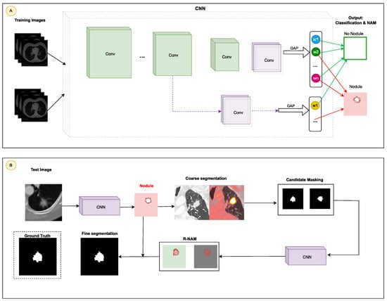 Architecture of the automated detection of juxta-pleural pulmonary nodules in []: (A) Training: a CNN is trained to identify CT images and create nodule activation mappings (NAMs); (B) Segmentation: test images identified as containing nodules are subjected to potential nodule filtering, based on a spatial delineation established by the NAM for initial segmentation. Residual NAMs (R-NAMs) are then generated using images in which potential nodules are masked, enabling more precise segmentation.