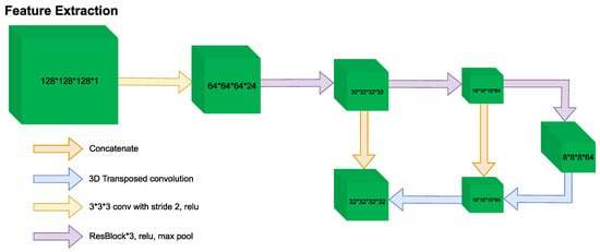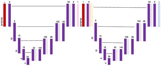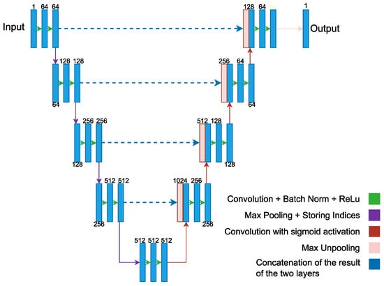 Aresta et al. [] introduced iW-Net, a deep learning model that allowed for automatic and interactive segmentation of lung nodules in computed tomography images. iW-Net was composed of two blocks: the first one provided automatic segmentation, and the second one allowed the user to correct it by analyzing two points introduced in the nodule’s boundary. The results of the study showed that iW-Net achieved SOAP with an intersection over union score of 55.00%, compared to the inter-observer agreement of 59.00%. The model also allowed for the correction of small nodules which is essential for proper patient referral decisions and improved the segmentation of challenging non-solid nodules, thus increasing the early diagnosis of lung cancer. iW-Net improved the segmentation of more than 75.00% of the studied nodules especially those with radii between 1–4 mm, which are crucial for referral. In Figure 8 the network used a 3 × 3 × 3 × N convolution followed by batch normalization and rectified linear unit activation where N is the number of feature maps indicated on top of each layer. It also used a 3 × 3 × 3 × N convolution with a 2 × 2 × 2 stride followed by batch normalization and rectified linear unit activation. The network then employed a 2 × 2 × 2 nearest neighbor up-sample and a 3 × 3 × 3 × N convolution with sigmoid activation. The source code for iW-Net is available at [].