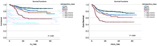 Based on the cell-of-origin classification, 255/928 (27.5%) were Activated B-cell-like (ABC), 543/928 (58.5%) were Germinal center B-cell-like (GCB), and 130/928 (14%) were Unclassified (UNC). According to the Sha C. et al. classification of the REMoDLB study [118], 249/928 (26.8%) were ABC, 468/928 (50.4%) were GCB, 83/918 (8.9%) were MHG, and 128/928 (13.8%) were UNC. Correlation between the two classifications showed that the MHG subtype was mainly included in the GCB subtype, but some cases were included into the ABC and UNC subtypes (Table 5).