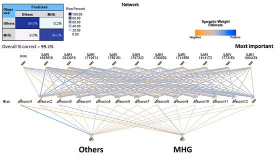 Neural networks are a simplified type of model that is based on the functional architecture of the nervous system. The process units are arranged into an input layer (predictors), one or more hidden layers, and an output layer (target fields). The network learns through training [34,35,36,37,38,39,40].