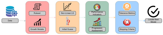 However, this approach might be used in other applications that utilize past knowledge to deliver valuable insights. Initially, a rule set was designed to outline the conditions that growth models must satisfy. In this instance, three criteria were devised to evaluate the produced models and identify the one with the most descriptive power. The primary criteria synthesized involved adequately approximating various data series, reflecting comparable behavior, and avoiding fluctuations between optimal and poor outcomes. After establishing these rules, a multitude of mathematical functions were utilized to evaluate how these phenomena may be interpreted and anticipated. Sigmoid functions, which mimic homeostasis because they include linear, exponential, and plateau phases, were also used. A curve-fitting pipeline was orchestrated based on the collected data, with a focus on addressing the initial guess problem.