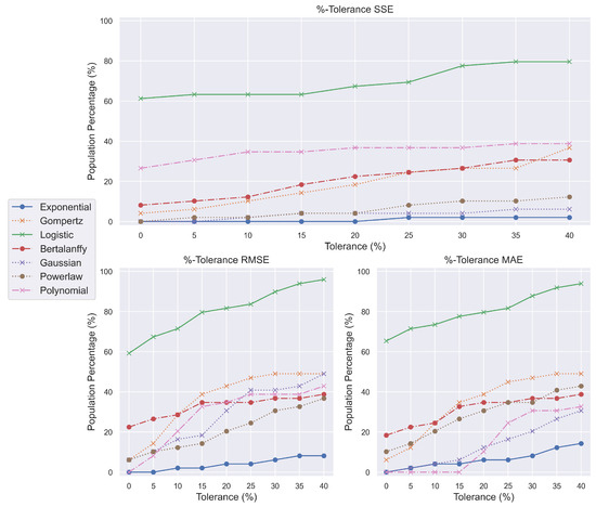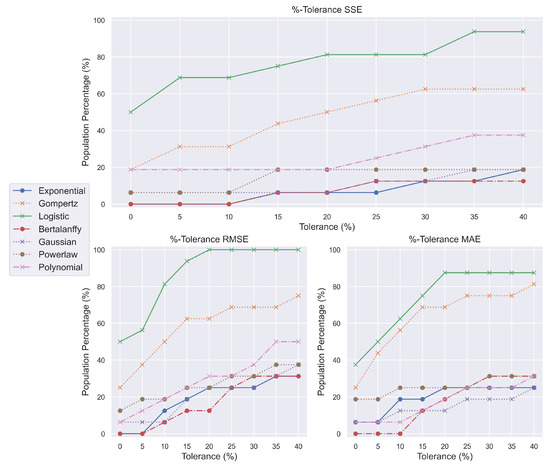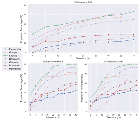 After LMA convergence, SSE, RMSE, and MAE served as primary performance indicators. To provide insight into model performance on the remaining data series, tolerance metrics were introduced. These metrics allowed for incremental encapsulation of model progression without sacrificing descriptiveness. In most cases, the logistic model outperformed competitors, demonstrating consistent behavior and capturing the entire population before 30%-tolerance metrics (