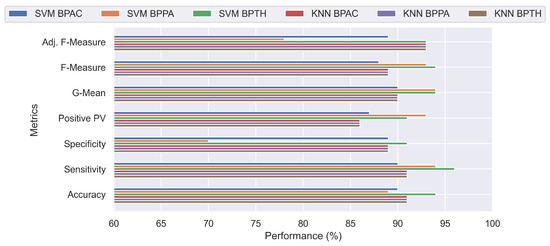 Figure 5). Specifically, all measures have satisfactory values, with the exception of the specificity metric, whose value of 54% indicates a class imbalance. Indeed, BPPA comprises 59 data points of one class compared to 16 observations of the other class; hence, additional performance metrics were utilized, such as geometric mean, F2-measure metric, and adjusted F-measure. However, the other metrics support the excellent performance of the classifier in this particular instance. It was determined not to apply more complex classifiers, such as kernel-based algorithms, because the employed approaches were effective despite their simplicity and because advanced approaches tend to overfit in small datasets, resulting in incorrect conclusions.