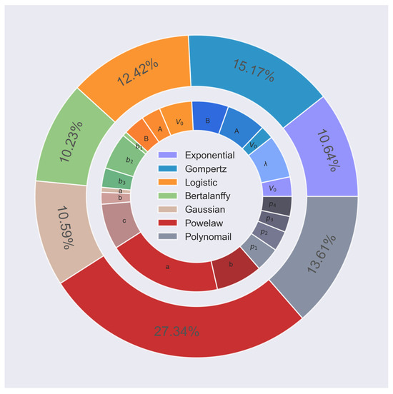 Figure 6. Power law generates the largest contribution (27.34%), which is to be expected for a simple model, given that the technique harnesses the variance of the experimental populations by separating it into systematic and random variables. With values ranging from 10.23% to 15.17%, the remaining growth models contribute almost the same, indicating that they are of equal importance.