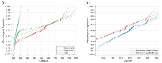 The straight lines represent the normal distributions of the analyzed populations with respect to the mean and standard deviations. When lines and markers are in close proximity, this indicates normality, suggesting that the compound’s behavior can be predicted and replicated with high confidence. The behavior of the blue benzopyrene line corresponds to a 95% certainty of mortality within 200 days after administrating the carcinogenic agent. There are also outliers, with one subject dying 70 days after the injection and another surviving up to 320 days.
