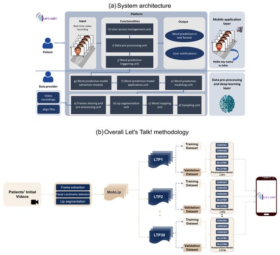 The Let’s talk! methodology, as illustrated in Figure 1, encompasses the preliminary stages of pre-processing, wherein procedures such as frame extraction, facial landmark identification, and lip segmentation are applied to the initial video data. These pre-processing steps contribute to the creation of the MobLip dataset, serving as the fundamental building block for subsequent stages. The synthesis of the MobLip dataset is a critical element in the pipeline, providing a robust foundation for training personalized models. Leveraging the 3D CNN and LSTM algorithm, these personalized models are tailored to individual patients, fostering a unique and precise approach to lip reading. Moving forward in the pipeline, the integration of these personalized models into the Let’s talk! mobile application marks a seamless transition, ensuring accessibility and usability for end-users. The mobile application is engineered to harness the real-time frame capture capability inherent in smartphones, particularly utilizing the front camera for optimal user engagement. The activation of this innovative feature initiates the integration of personalized models, thereby empowering users with access to a highly tailored and efficient speech recognition functionality. The strategic interplay of pre-processing, dataset synthesis, model training, and mobile application integration underscores the holistic and carefully orchestrated nature of the Let’s talk! methodology.