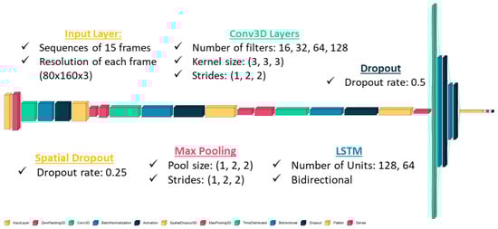 Table 3 presents the key parameters employed during the training of the lip-reading model. The input shape, initialized with the dimensions (15, 160, 80, 3), represents a sequence of 15 frames, with each frame consisting of an image of size 160 × 80 pixels in RGB format. The subsequent layers unfold the specifics, including padding, convolutional strides, kernel sizes, and dropout rates, capturing the details of the 3D CNN and LSTM architecture. Notably, the bidirectional LSTM layers introduce memory units of 512, fostering the model’s capacity for capturing temporal dependencies. The final dense layer, activated through softmax, outputs predictions for a variable number of classes. Additional training configurations, such as batch size (32) and epochs (500), are also documented. The model architecture is summarized in Figure 2.