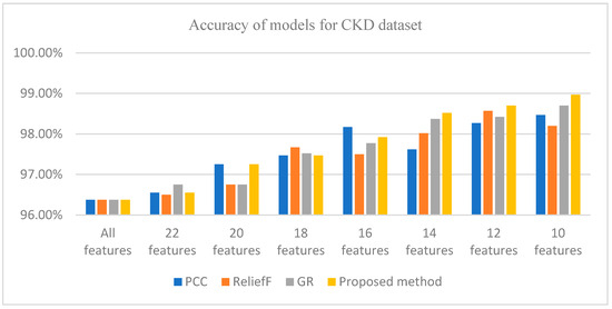 Accuracy of different methods for the CKD dataset for different numbers of features.