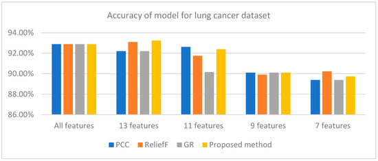 Accuracy of different methods for lung cancer dataset for different numbers of features.