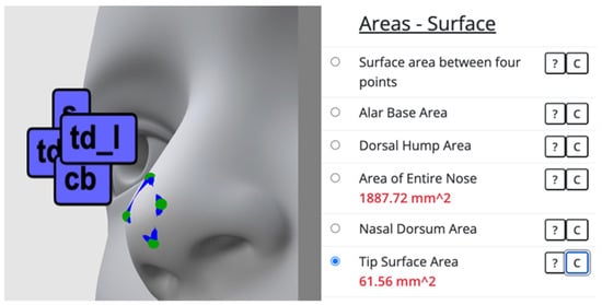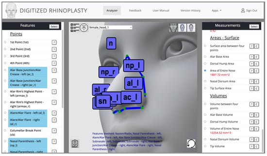 Besides various commercial applications [,,], free web-based software tools that use 3D imaging to perform facial analysis have been introduced []. However, these facial analysis tools still only perform traditional 2D measurements, such as measurements of the distances and angles between facial landmarks. The benefit of utilizing more advanced measurements, such as area and volume, has been pointed out in the literature [,]. We have recently introduced area and volume measurement techniques for facial surgeries, aimed at augmenting surgeons’ abilities to precisely analyze facial structures and plan surgeries. This novel addition to facial analysis is intended to significantly improve surgical outcomes and enhance the overall success of facial surgical procedures [,]. We have developed open-source algorithms to measure area and volume on a 3D facial model [] and then utilized these algorithms to enhance the free web-based software called Face Analyzer [] to help surgeons perform a more in-depth analysis of a patient’s face []. The Face Analyzer software, hosted at digitized-rhinoplasty.com, is now capable of measuring the area and volume of certain regions, such as the dorsal hump, nasal dorsum, root of the nose (Radix), and tip of the nose, and it is based on several previous works [,,].