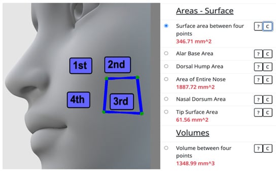 We defined area and volume measurements utilizing the facial landmarks described in the literature [,,]. These area and volume measurements focus on the regions around the nose and can be utilized to quantify the alterations performed via rhinoplasty. However, new area and volume measurements can be defined for any region of the face, and web-based software can be utilized for the computation of the measurements.