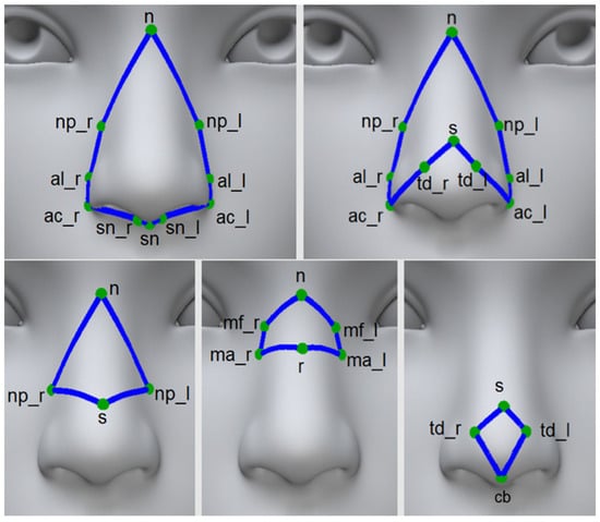 The same boundary landmarks define area and volume measurements with the same name. For example, the supratip break point, tip defining points (left and right), and columellar break point are the boundary landmarks used to compute both the area and volume of the tip measurement. The boundaries of each measurement, as illustrated in Figure 5, are denoted using standard landmark abbreviations (np_r, al_l, ac_r, sn_r, etc.) [].