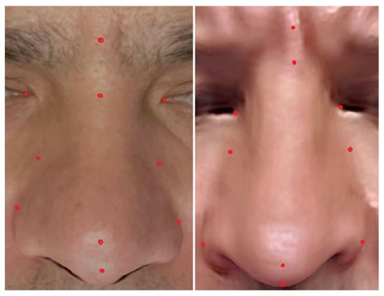 Red dots were placed on the texture images of the 3D models to indicate each facial landmark used in the measurements. This approach maintained consistent landmark identification, minimizing variations in landmark positioning when comparing agreement between the web software and Blender software (version 3.2, Amsterdam, The Netherlands). Figure 6 illustrates these texture images with the red dots.