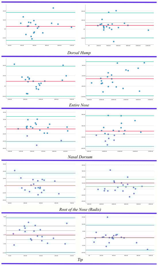 Bland–Altman plots for each measurement. The (left column) represents the area, and the (right column) represents the volume measurements.