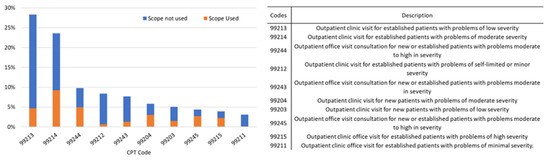 Top ten encounter types (described by the CPT code listed) by scope use during visit.