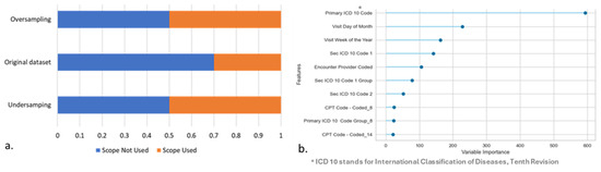 Following the EDA, feature encoding expanded the number of features to 18. To handle missing values and address imbalances in the dataset, iterative imputation and SMOTE techniques were applied, respectively. Subsequently, the dataset’s dimensionality was reduced using PyCaret’s feature selection tool, which amalgamates various permutation importance techniques like Random Forest, AdaBoost, and Linear correlation with the target variable (i.e., scope used or not). Parts a and b in Figure 4 illustrate the effects of balancing and dimension reduction in our dataset.