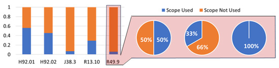 But by having a closer look at R49.9, where 94% of the code resulted in not using scopes, the distribution is vastly different across different clinicians as illustrated in Figure 5. Figure 6 displays the top ten reported ICD-10 codes in our dataset.