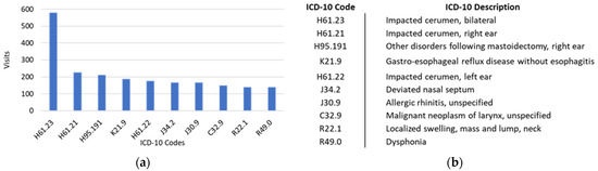 As shown in Figure 4b, most of the reported top ten features are ICD-10 codes. ICD-10 stands for the International Classification of Diseases—Tenth Revision, which is an international diagnosis system designed for representing conditions and diseases and any health-related problems, abnormal findings, signs and symptoms, injuries, and external causes of injuries and diseases [18]. The ICD-10 codes are a part of the patient’s medical record and may require imaging, labs, or a clinical workup based on a patient’s chief complaint(s) for the visit. These codes are generally available for returning patients to ENT before a clinic visit. New patients to specialty clinics such as ENT may have pre-visit ICD-10 codes included in their referral to the clinic which is then validated during the visit. ICD-10 codes R49.9 (Unspecified voice and resonance disorder (hoarseness)), R13.10 (Dysphagia, unspecified), J38.3 (Other diseases of vocal cords), H92.01 (Otalgia, right ear), and H92.02 (Otalgia, left ear) were all pre-visit diagnoses that may result in scope use during the patient’s visit. J38.3 (Other diseases of vocal cords) and H92.02 (Otalgia, left ear) were identified as important features by the model.