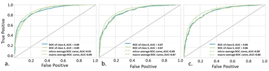 The data preprocessing phase is followed by training and evaluating predictive models. The predictive analytics starts by implementing 10-fold cross validation, where datasets are divided into training and testing sets (2/3 and 1/3, respectively) in each fold. Evaluating the performance of models trained over 10 folds, GB, LGB, and LR have the best performance among all the trained models. Figure 7 displays the ROC curves for the trained GB (Figure 7a), LGB (Figure 7b), and LR (Figure 7c) models. These curves demonstrate the performance of the mentioned classification models for both classes in addition to the micro- and macro-averages across different thresholds. The developed GB, LGB, and LR models presented ROCAUC scores of 96%, 98%, and 99%, respectively. The diagonal line in ROC curves represents the behavior of a random classifier which has no better chance of detecting positive/negative labels than flipping a fair coin. The distance among the trained models’ ROC curve from the 45-degree diagonal of the ROC space demonstrates the high performance of these models.